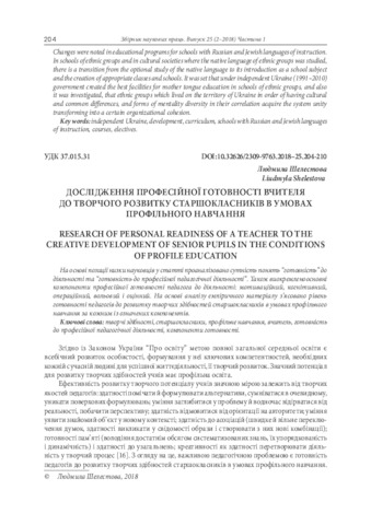 - Шелестова, Л.В. (orcid.org/0000-0002-6057-8070) (2018) Research of personal readiness of a teacher to the creative development of senior pupils in the conditions of profile education Педагогічна освіта: теорія і практика, 1 (25). pp. 204-210. ISSN 2309-9763