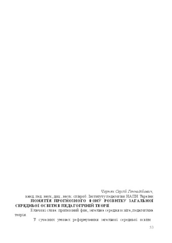 - Черняк, С.Г. (2016) The concept of the forecast background of the development of general secondary education in pedagogical theory In: Прогнозування розвитку педагогічної інноватики: Збірник тез Всеукраїнської науково-практичної конференції до 90-річчя Інституту педагогіки НАПН України) . Інститут педагогіки НАПН України, м. Київ, Україна, pp. 53-56.