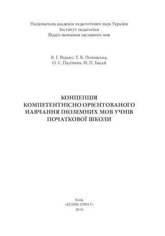 Редько, Валерій Григорович, Полонська, Тамара Костянтинівна, Пасічник, Олександр Сергійович and Басай, Надія Пилипівна (2018) Concept of competence-based teaching of foreign language to students of elementary school . Конві Прінт, м. Київ, Україна. ISBN 978-617-7724-06-2