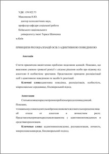 - Максимова, Н.Ю. (2013) Principles resocialization persons with addictive behavior Актуальні проблеми психології: зб. наук. праць Інституту психології імені Г.С. Костюка НАПН України, 33 (7). pp. 297-304. ISSN 966-8321-16-2