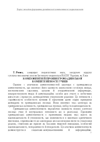 - Ремех, Тетяна Олексіївна (2018) Components and manifestations of civic competence of students In: Abstracts of the All-Ukrainian Scientific and Practical Conference "Theory and Methods of Formation of Civic Competence of Senior Students in the Conditions of Innovative Development of a Modern Gymnasium": Kyiv, October 18, 2018. . Педагогічна думка, м. Київ, Україна, pp. 27-29.
