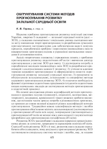 - Гораш, Катерина Вікторівна (orcid.org/0000-0001-8625-9774) (2016) Justification of the system of forecasting methods for the development of general secondary education In: Анотовані результати науково-дослідної роботи Інституту педагогіки НАПН України за 2016 рік . Педагогічна думка, м. Київ, Україна, pp. 65-66. ISBN 978-966-644-398-5