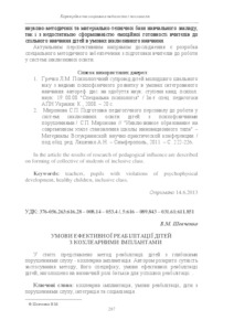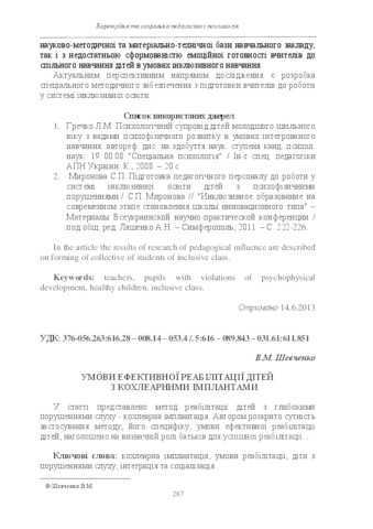 - Шевченко, В.М. (orcid.org/0000-0003-0119-3206) (2013) Conditions for the effective rehabilitation of children with cochlear implants Collection of scientific papers Kamenetz-Podolsk National University behalf of Ivan Ogienko, 22 (2). pp. 287-294. ISSN 2309-8341