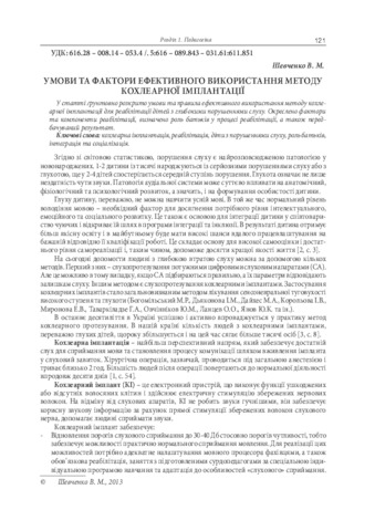 - Шевченко, В.М. (orcid.org/0000-0003-0119-3206) (2013) Conditions and factors for the effective use of the method of cochlear implantation Pedagogical education: theory and practice (15). pp. 121-125.