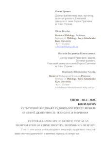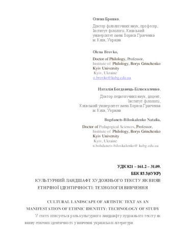 - Богданець-Білоскаленко, Наталія and Бровко, Олена (2017) Cultural landscape of artistic text as an manifestation of ethnic identity: technology of study Гірська школа українських Карпат (17). pp. 136-139. ISSN 1994-4845
