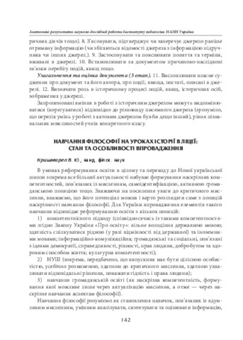 - Кришмарел, В. Ю. (2018) Learning philosophy at the history lessons in the lyceum: the state and features of the implementation In: Анотовані результати науково-дослідної роботи Інституту педагогіки НАПН України за 2018 рік . Педагогічна думка, м. Київ, Україна, pp. 142-143. ISBN 978-966-644-464-9