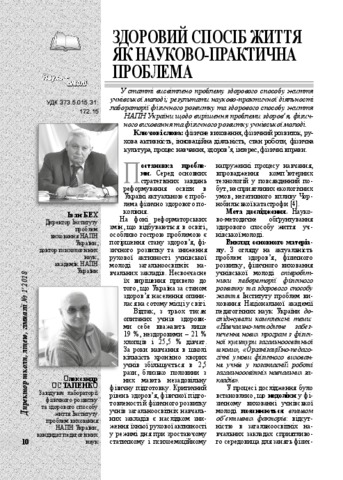 - Бех, І.Д. and Остапенко, О.І. (orcid.org/0000-0001-5343-0088) (2018) Healthy way of life as a scientific-practical problem Директор школи, ліцею, гімназії, 1. pp. 10-12. ISSN 2309-7744