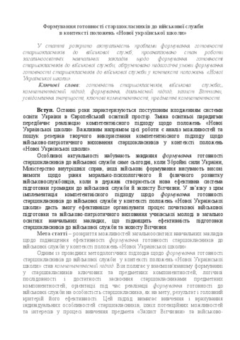 The article reveals the urgency of the problem of forming the readiness of high school students for military service; the state of work of general educational establishments is analyzed in relation to formation of readiness of high school students for military service; The pedagogical conditions of formation of readiness of high school students for military service in the context of the provisions of the "New Ukrainian School" are substantiated.