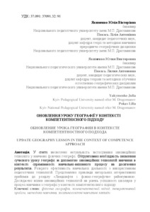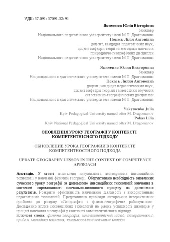 - Покась, Лілія Антонівна (orcid.org/0000-0002-6791-4507) and Якименко, Юлія Вікторівна (2016) Update geography lesson in the context of competence approach Молодий вчений, 2 (29). pp. 356-359. ISSN 2304-5809