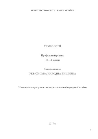 The program of the technological profile of training on the specialization "Ukrainian folk embroidery" is aimed to form the key and subject design and technological competences of senior pupils; conscious choice of embroidery profession or related professions; revival and creation of national cultural and historical traditions of the Ukrainian people; realization of design and technological activities in social and communicative interaction with others.