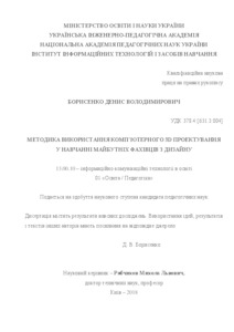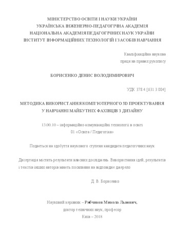 - Борисенко, Д.В. (orcid.org/0000-0001-5566-6406) (2018) Method of Using Computer 3D Designing in the Training of Future Expert in Design Dissertation candidate thesis, Українська інженерно-педагогічна академія.