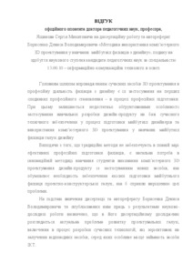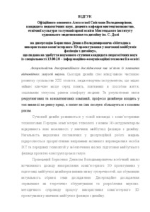 The dissertation for scientific degree of the candidate of pedagogical sciences, specialty 13.00.10 – information and communication technologies in education. – Ukrainian Engineering Pedagogics Academy, Institute of Information Technologies and Learning Tools of NAPS of Ukraine, Kyiv, 2018. The dissertation is devoted to a problem of improvement of quality of training of future expert in design on discipline of "Bases of Shape Formation" and "Computer Design" by formation of professional abilities of using computer 3D designing during development of a design-product. It is certain that the method of using computer 3D designing in the training of future expert in design needs to be based on model of stage-by-stage mastering software packages for 3D-development, three component technical providing (the 3D-scanner, a holographic pyramid and the 3D-printer) and models of an educational task of development to a design product in the course of studying of special disciplines "Computer Design" and "Bases of Shape Formation". The model of a technique of training of future expert in design which includes is theoretically grounded and developed, which includes the types of acquaintance and mastery of information and communication means: generalized review, practical review and practical application for performing educational tasks. Pilot studies confirmed efficiency of the developed methodical system of using computer 3D designing in the training of future expert in design. The model of the structure of the methodology for using computer 3D design in the training of future expert in design is theoretically grounded and developed, which focuses on a generalized sequence model from the types of acquaintance with ICT tools and includes: generalized survey (involves a theoretical review of the main function of ICT facilities, features and features, the level of application among professionals and other indicators without practical application), practical-review (involves theoretical knowledge with practical limited mastery) and practical application for educational tasks (includes a brief theoretical review and widespread practical application during the implementation of the cycle of practical and laboratory tasks). A computer 3D design methodology is developed in the course of future design professionals based on the 3D-development software packages (based on Autodesk 3D Max, Maya, Marvelous Designer, Poser Pro, Shoe Maker), three-component technical support (3D scanner, holographic pyramid and 3D printer) and models for the initial assignment of design product development in the course of studying special disciplines "Computer Design" and "Bases of Shape Formation". Step-by-step familiarization of students with information and communication means represents the comprehensive coverage of the available spectrum of opportunities for entry into the innovative professional activity of the future specialist in design and formation of the corresponding hierarchical model, which includes: office, universal, special, virtual and software package of 3D formations. A separate role in the professional training of future design professionals is given to organizing a cycle of application of modern technical means: 3D scanner - holographic pyramid - 3D printer. Recommendations for faculty members regarding the training of future design specialists are developed. For the purpose of effective use of computer 3D design in the training of future design specialists, it is necessary to take into account the developed recommendations for the administration of higher education institutions and teaching auxiliary staff. The practical significance of the results is that: the components of the method of using computer 3D design in the training of future expert in design have been developed and described; the educational and methodological complex of disciplines "Computer Design" and "Bases of Shape Formation" was developed using computer 3D design in the training of future expert in design, consisting of a program of academic discipline, laboratory practice, guidelines for laboratory works and independent work, distance learning course at Moodle; the choice of ICT tools for computer 3D design was carried out, which is expedient to use in the training of the most experienced expert in design; Recommendations for faculty members, administration of higher education institutions and teaching auxiliary staff on the use of 3D computer design in the training of future expert in design have been prepared. It is proved that the organization of the educational process of preparing future specialists in design on the basis of a specially developed method of using computer 3D design allows to increase the effectiveness of the learning process, in particular, to develop the professional skills of using computer 3D design during the development of a design product in the process the study of special disciplines "Computer Design" and "Bases of Shape Formation". The results of the implementation of the developed methodology for using computer 3D design in the training of future e[pert in design support its effectiveness and hypothesis of research, which makes it possible to recommend the author's methodology for the wide introduction into the learning process of the future design professionals in higher education institutions of Ukraine . The study does not exhaust all aspects of this problem, more research needs a substantiation of the theoretical and methodological principles of training future design professionals with the use of ICT tools in the study of other special disciplines.