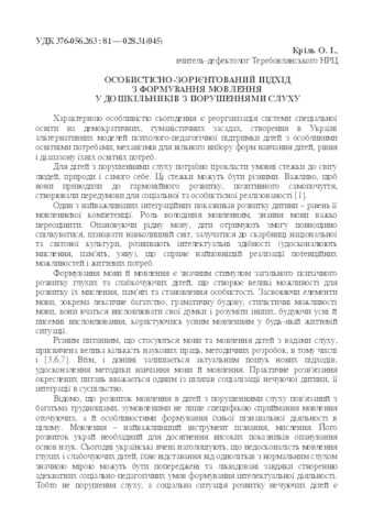 - Кріль, О.І. (2018) Personally oriented approach to the formation of speech in preschool children with hearing impairments In: Інклюзивне навчання в новій українській школі: Матеріали міжнародної науково-практичної конференції “Інклюзивне навчання в Новій українській школі” (26 -27 березня 2018 р., м. Теребовля) . Інтерсервіс, м. Теребовля, Україна, pp. 142-148. ISBN 978 - 617 - 696 - 722 - 4