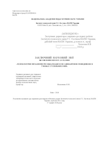 The report prepared by the scientists of the laboratory of psychology of socially disadvantaged minors G.S. Kostiuk Institute of Psychology of the National Academy of Sciences of Ukraine addresses the psychological mechanisms of re-socialization of persons with deviant behavior in the conditions of social changes through the analysis of the features of the functioning of the image of I, the value-semantic sphere, reflection, motivation and function forecast The theoretical model of re-socialization of persons with deviant behavior depending on the type of social maladaptation is developed; the content and functional parameters of resocialization are determined, empirically tested principles, directions and technologies based on knowledge about the mechanisms of re-socialization of persons with deviant behavior. The results of the research presented in the monograph allow us to create a system of re-socialization of deviant in conditions of social change. The results of the study will be useful for scientists, students, practical psychologists, teachers of educational institutions of different levels of accreditation, specialists in the field of juvenile prevention, social services for children, families and youth, social rehabilitation institutions for children, penitentiary institutions, psychologists and social educators.