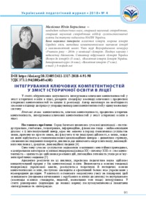 - Малієнко, Юлія Борисівна (2018) Integrating the key in the content of history education at a lyceum Український педагогічний журнал, 4. pp. 91-98. ISSN 2411-1317