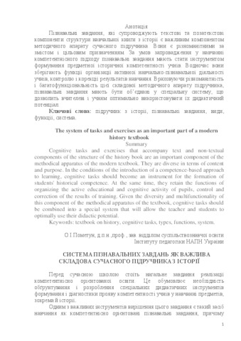 - Пометун, Олена Іванівна (2015) The system of tasks and exercises as an important part of a modern history textbook Історія і суспільствознавство в школах України: теорія та методика навчання, 9. pp. 34-39.