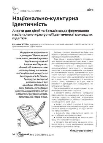 - Журба, Катерина Олександрівна (orcid.org/0000-0002-3854-4033) (2018) National-cultural identity. Questionnaires for children and parents about formation national-cultural identity of the younger ones teenagers Шкільний світ, 8 (784). pp. 10-13.