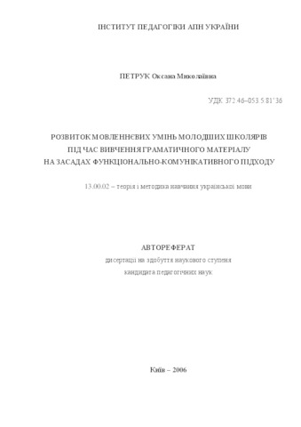 The dissertation at competition for scientific degree of pedagogical sciences candidate by speciality 13.00.02 – theory and methods of Ukrainian language teaching. Institute of Pedagogics Academy of Pedagogical sciences of Ukraine.– Kyiv, 2005. The study is devoted to problem of junior pupils’ speech abilities development in the process of learning native language’s grammar material by functional-communicative approach realization. At the first chapter of the dissertation the methods of forming the speech abilities in the process of learning grammar material on the grounds of functional-communicative approach are theoretically substantiated; the essence of the functional-communicative approach and importance of its usage wilt the purpose of pupils’ speech abilities development are presented; the linguistic analysis of the functions of Ukrainian grammar categories, which learn in the first forms is made; psychologic-pedagogical conditions of learning the grammar material by junior pupils’ and their communicative development is examined; the state of realization of the functional-communicative approach at the study process. At the second of the dissertation the principles of forming the methods, learning approaches and methods, kind of exercises and their systematization are examined; organization of the experimental studying and checking the effectiveness of elaborated methods of pupils’ speech abilities development in the process of learning grammar material on the grounds of functional-communicative approach is described. The effectiveness of methods is substantiated and demonstrated theoretically. The material of the dissertation can be used in the process improvement the content of syllabus and textbooks, while elaborating the methodical mother tongue textbooks. Part of the investigated material (exercises, tasks’ models / examples usw) can be used as language course chapters.