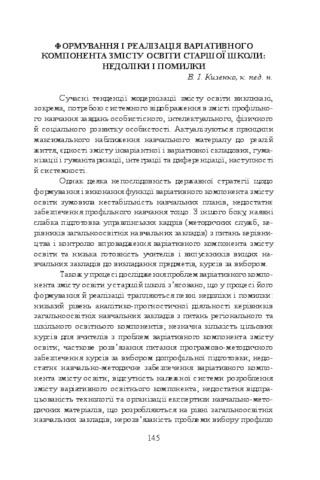 - Кизенко, Василь Іванович (2015) Formation and realization of a variant component of the content of education of upper secondary school: shortcomings and mistakes In: Анотовані результати науково-дослідної роботи Інституту педагогіки НАПН України за 2015 рік . Педагогічна думка, м. Київ, Україна, pp. 145-146. ISBN 978-966-644-398-5