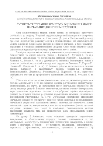 - Васьківська, Галина Олексіївна (orcid.org/0000-0002-8714-8512) (2016) The essence of testing as a method of assessing the quality of academic achievements of pupils In: Актуальні проблеми підготовки сучасного педагога: теорія, історія, практика: матеріали Всеукраїнської наукової Інтернет-конференції, м. Умань, 20 жовтня 2016 р. . ВПЦ «Візаві», м. Умань, Україна, pp. 13-15.