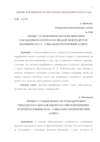 - Вініченко, А.А. (2016) Process of incipience of the system of parochial church education in the Russian empire in the XIX century: social and political aspects The theory and methods of educational management, 1 (17). pp. 1-13. ISSN 2310-2411