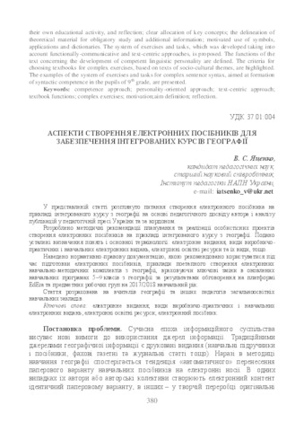 - Яценко, Володимир Сергійович (2017) Аspects of creation of electronic textbooks for provision of integrated courses in geography Проблеми сучасного підручника (19). pp. 380-389. ISSN 2411-1309