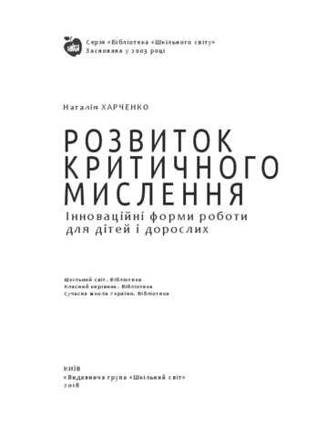 - Харченко, Наталія Вікторівна (2018) Development of critical thinking: innovative forms of work for children and adults [Teaching Resource]