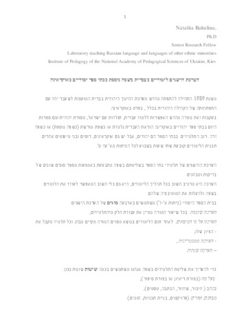 - Bakulina, Nataliia Valeriivna (orcid.org/0000-0002-8970-2660) (2015) Evaluation of academic achievements in Hebrew as an additional language in primary schools in Ukraine In: International Conference on Hebrew Language, Literature and Culture, University of Memphis, June 22-24, 2015 , 2015 . The National Association of Professors of Hebrew, c. Memphis, USA, pp. 5-9.