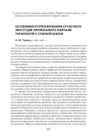The theoretical basis and methodology of designing the content of specialized technology education in the senior school have been developed. The conceptual provisions of forming the creative personality of senior pupils in the process of profile education in the specialty "Scientific and technical creativity" have been determined. It is emphasized that in the process of designing the content of the specialization "Scientific and technical creativity" the following principles should be taken into account: scientific, accessibility, integrity and systemicity, integrability, interconnection and interdependence of theory and practice, systemicity, continuity, perspective, professional orientation.