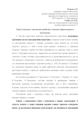 - Руденко, І.В. and Куцоп'ят, Н.В. (2018) Creative tasks in the preparation of future teachers of fine arts Зб. матеріалів Всеукраїнського електронного наук.-практ. семінару «Інноваційні підходи до розвитку педагогічної майстерності вчителів мистецьких дисциплін». pp. 112-116. ISSN 978-966-2123-73-9
