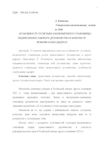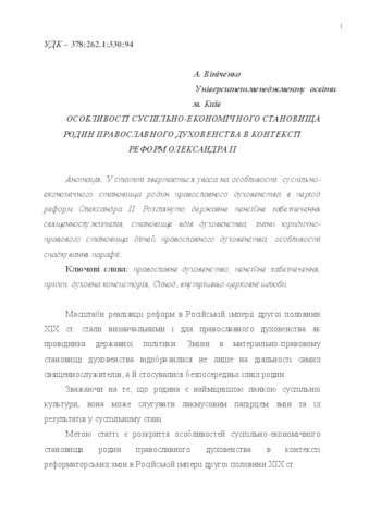 - Вініченко, А.А. (2016) Features of socio-economic position of the families of the orthodox clergy in the context of the reforms of Аlexander ІІ In: Православ’я в Україні. Збірник матеріалів VІ міжнародної наукової конференції , 1 . Київська православна богословська академія, м. Київ, Україна, pp. 501-506. ISBN 978-966-2779-68-4
