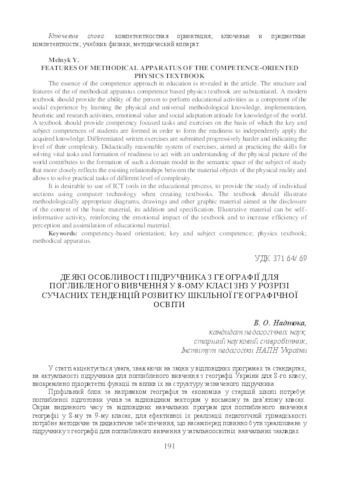 - Надтока, Віктор Олександрович (2017) Some features of the syllabus textbook for in-depth study in the 8th grade of the HEI in the context of contemporary trends in the development of school geographic education Problems of the modern textbook (19). pp. 191-202. ISSN 978-966-544-404-5