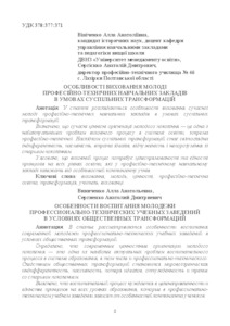 This article deals with the peculiarities of the youth education at vocational schools in the conditions of social transformations. Determined that modern preferences of values of the younger generation is one of the most actual problems in the educational system including the vocational one. Consequences of social transformations are indifference of views, passivity, loss of ideals, alienation and misunderstanding the older generation. It was found that the educational process requires attention and unity of principles at all levels of education. Principles of educational process depends on the characteristics of a contingent of students in a vocational school.
