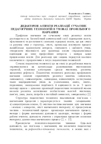 - Васьківська, Галина Олексіївна (orcid.org/0000-0002-8714-8512) (2018) Didactic aspects of the realization of modern pedagogical technologies in profile education In: Модернізація освітнього середовища: проблеми та перспективи : матеріали Четвертої Міжнародної науково-практичної конференції, м. Умань, 11–12 жовтня 2018 р. . ВПЦ «Візаві», м. Умань, Україна, pp. 40-45.
