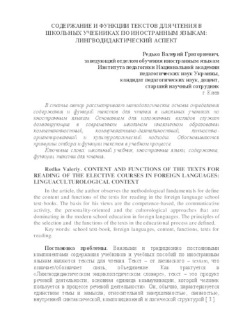 - Редько, Валерій Григорович (2015) Content and functions of the texts for reading of the elective courses in foreign languages: linguaculturological context Замежныя мовы, 4 (58). pp. 9-16. ISSN 1993-3576