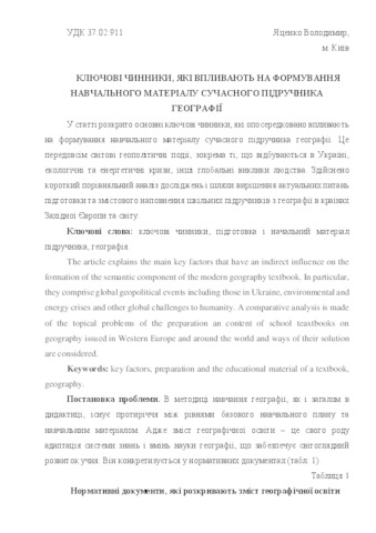 - Яценко, Володимир Сергійович (2017) Key factors influencing the formation of educational material of the modern textbook geography Актуальні проблеми в системі освіти: загальноосвітній навчальний заклад – доуніверситетська підготовка – вищий навчальний заклад: зб. наук. праць матеріалів III Всеукраїнської науково-практичної конференції, 27 квітня 2017 р., м. Київ, НАУ (3). pp. 310-312.