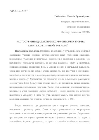 - Побидайло, Наталія Григорівна (2017) Application of didactic local geography games on the lessons of physical geography. Наукові записки Бердянського державного педагогічного університету. Серія: Педагогічні науки, 2. pp. 284-289. ISSN 2412-9208