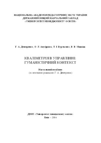 Дмитренко, Геннадій Анатолійович, Ануфрієва, О.Л. (orcid.org/0000-0002-8465-1681), Бурлаєнко, Т.І. (orcid.org/0000-0001-5734-4611) and Медвідь, В.В. (2016) Qualimetry in management: humanistic context . Аграрна освіта, м. Київ, Україна. ISBN 978-966-483-647-7