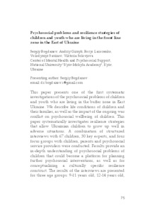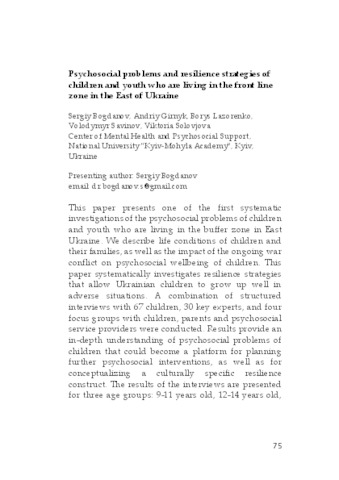 - Bogdanov, Sergiy (orcid.org/0000-0002-0218-5067), Girnyk, Andriy, Lazorenko, Borys (orcid.org/0000-0002-2113-0424), Savinov, Volodymyr (orcid.org/0000-0001-5830-2333) and Solovjova, Viktoria (2017) Psychosocial problems and resilience strategies of children and youth who are living in the front line zone in the east of Ukraine In: Bridging Across Generations: Turning Research into Action for Children and Families Abstracts: 15th Symposium on the Contributions of Psychology to Peace, 21–27 May 2017, Rome and Florence, Italy COMPENDIUM OF ABSTRACTS from Symposium on the Contributions of Psychology to Peace (15). UNICEF Office of Research, Center of Mental Health and Psychosocial Support, Sapienza, University of Rome, м. Флоренція, Італія, pp. 75-76.