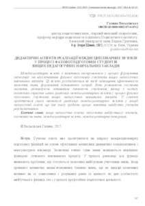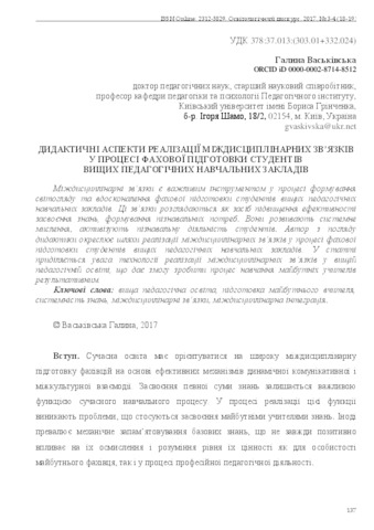 - Васьківська, Галина Олексіївна (orcid.org/0000-0002-8714-8512) (2017) Didactic aspects realization of interdisciplinary ties in process training students of highers pedagogical educational establishments Освітологічний дискурс, 3-4 (18-19). pp. 137-149. ISSN 2312-5829