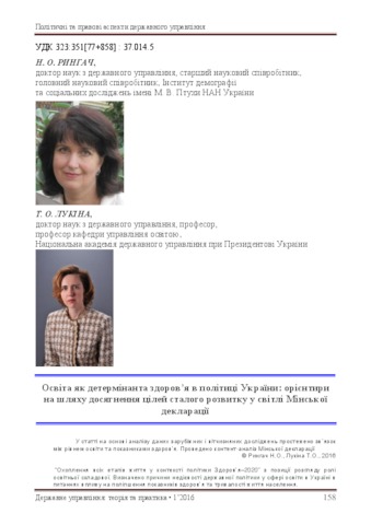 - Лукіна, Т.О. (orcid.org/0000-0002-3802-6666) and Рингач, Н.О. (2016) Education as determinant of health in policy of Ukraine: orientations towards achieving goals of sustainable development in the light of Minsk declaration Державне управління: теорія і практика, 1. pp. 158-171. ISSN 2311-6722