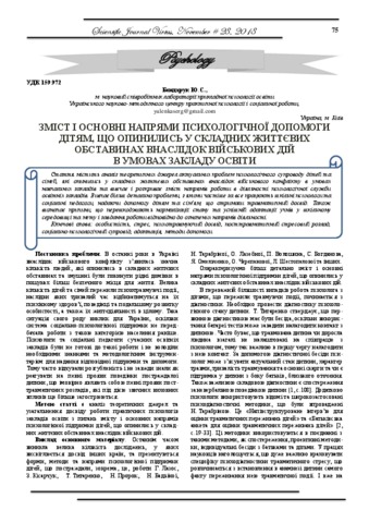 - Бондарук, Юлія Сергіївна (orcid.org/0000-0001-9162-1811) (2018) The content and main directions of psychological assistance to children who were in difficult living conditions as a result Virtus (28). pp. 75-80. ISSN 2410-4388