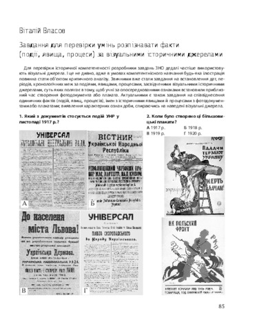 - Власов, Віталій Сергійович (2018) Tasks to test the ability to recognize facts (events, phenomena, processes) by visual historical sources Історія і суспільствознавство в школах України: теорія та методика навчання, 5. pp. 75-96.