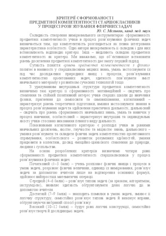 - Мельник, Ю.С. (orcid.org/0000-0002-1268-6199) (2016) Criteria for the formation of the subject competence of high school students in the process of solving physical problems In: Анотовані результати науково-дослідної роботи Інституту педагогіки НАПН України за 2016 рік . Педагогічна думка, м. Київ, Україна, pp. 234-235. ISBN 978-966-644-398-5