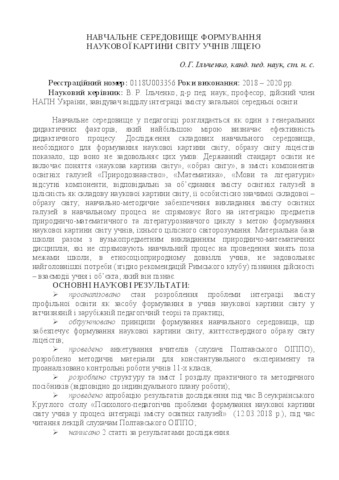 - Ільченко, Олексій Георгійович (orcid.org/0000-0002-7188-9818) (2018) Educational Environment for the Formation of a Scientific Picture of the World of Pupils in the Lyceum In: Annotated Results of Research ork of the Institute of Pedagogy of the National Academy of Sciences of Ukraine for 2018 . Педагогічна думка, м. Київ, Україна, pp. 202-203. ISBN 978-966-644-464-9