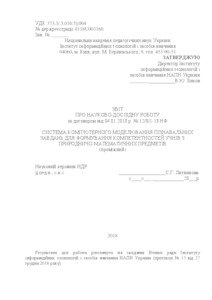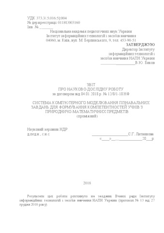 - Литвинова, С.Г. (2018) Report on the research work "The system of computer modeling of cognitive tasks for the formation of students' competences in natural-mathematical subjects" (intermediate)" ІІТЗН НАПН України, м. Київ, Україна. (Unpublished)