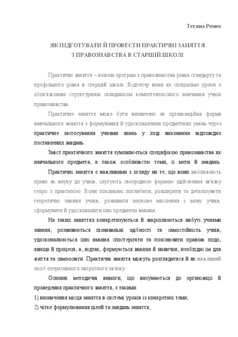 - Ремех, Тетяна Олексіївна (2016) How to prepare and conduct practical classes in jurisprudence in high school Історія і суспільствознавство в школах України: теорія та методика навчання, 11. pp. 34-36.