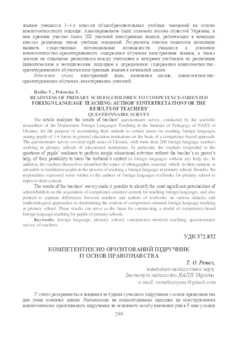- Ремех, Тетяна Олексіївна (2017) A competence oriented textbook "Fundamentals of Law" Проблеми сучасного підручника, 19. pp. 299-309. ISSN 2411-1309