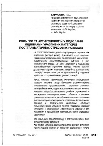 - Тарасова, Т. В. (2018) The role of game and art technology in post-traumaticstress disorder overcoming by adolescent Пост-травматичний стресовий розлад: дорослі, діти та родини в ситуації війни, 2. pp. 511-519.