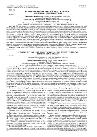 The purpose of this article is to reveal the potential of history lessons in the development of students’ critical thinking, which can be realized providing special organization of active learning of students. Under critical thinking, the authors understand the purposeful, active, disciplined (organized according to certain criteria) independent thinking, which allows a person to effectively solve problems and make justified decisions. Among the ways of developing critical thinking in history lessons that are analyzed in the article on concrete examples there are: the organization of free talk and discussion, teaching students to ask questions and recognize the relationships, evaluate information, historical interpretations and the sources from which they come. The article emphasizes the need for the teacher to diversify the sources of information. The information around which students’ reflections are based should be given to them orally, in written, electronic forms, through visual sources, and, if possible, historical artefacts. The main task of the teacher is to ask questions and give tasks, which require from students to use the high-level thinking operations. Development of students’ thinking can be facilitated by performing group tasks for solving problems or creative projects that involve comparing and evaluating various sources of historical information. However, such work should be done consistently in each lesson, using all the possibilities of historical material.